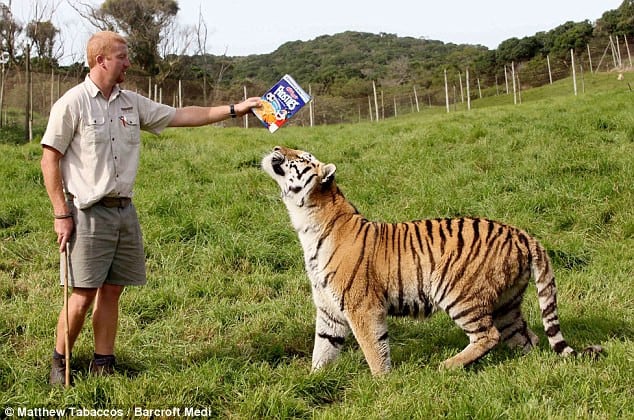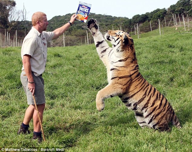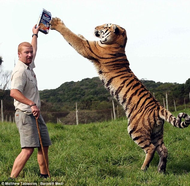 In a remarkable display of warmth, Shosho, a Siberian tiger, springs up to nab a box of his most-liked cereal from his caretaker, Ashley Gombert.