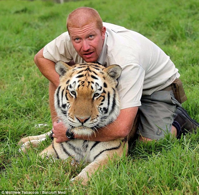 Identifying himself as a tiger wrangler, Ashley acknowledges the physical challenge of being around such an enormous creature.