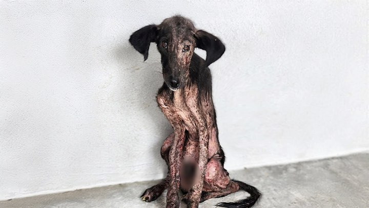 In a dim alley, a once radiant dog lay abandoned, its skin singed and fragile muscles attesting to prolonged neglect.