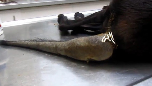Her distress was evident; a chain wire had tightly wrapped around her tail, causing it to swell painfully.