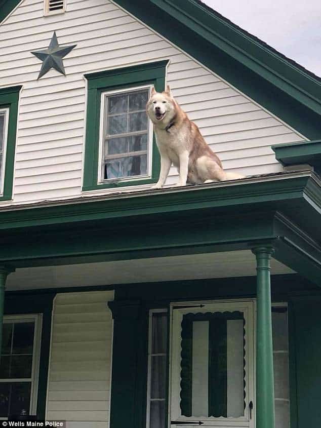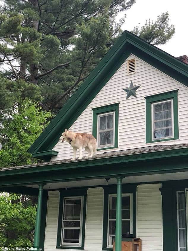 The Wells, Maine, police department received multiple concerned calls from locals, reporting that a curious husky-cross breed was stuck on a rooftop.