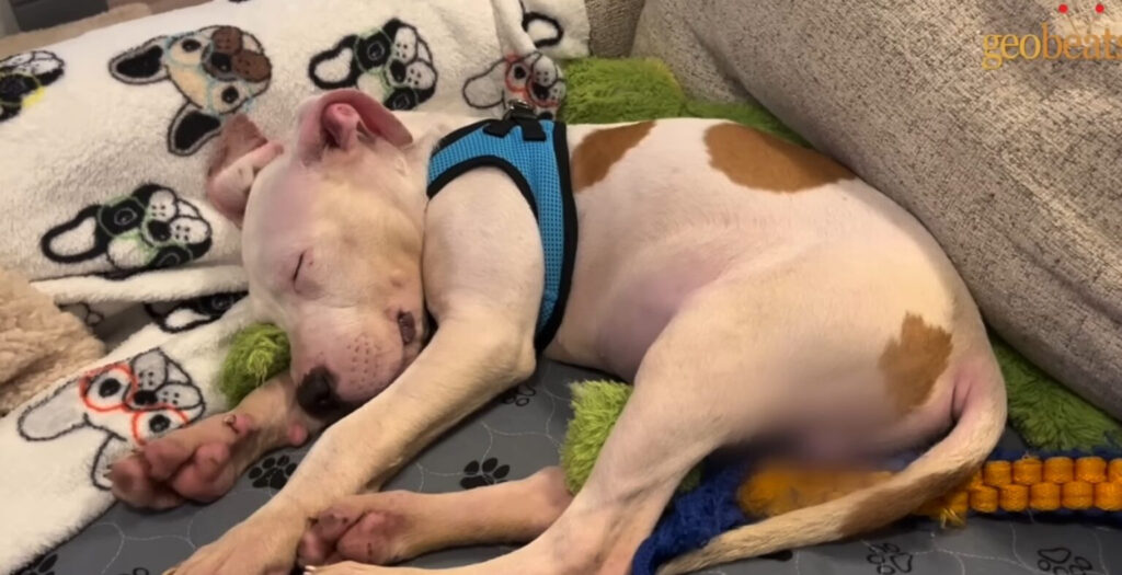 Just over a week later, he looked like a different dog—eating peanut butter for the first time, learning to walk confidently on grass, and even wagging his tail when Roger or his daughter entered the room.