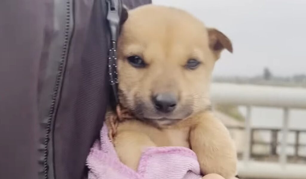 The puppy, only a month old, was tightly bound and sat trembling by the roadside, terrified and whimpering.