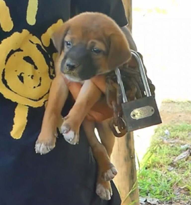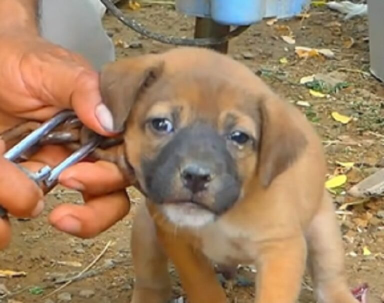 The little animal was in terrible condition, wrapped tightly in chains and visibly frightened.