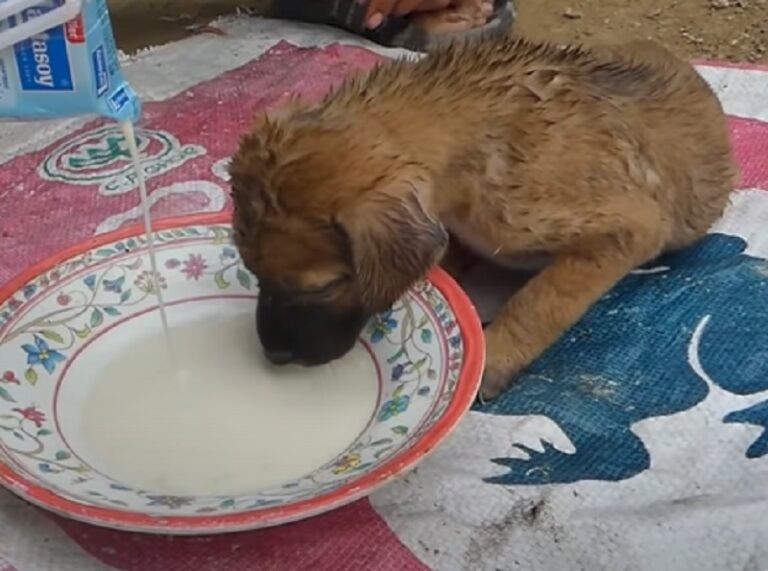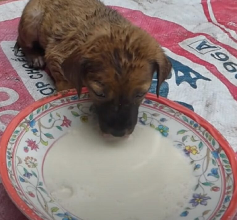 The sight of the dog eagerly drinking milk suggested it had been hungry for a long time, eliciting a mix of amusement and empathy from its savior.