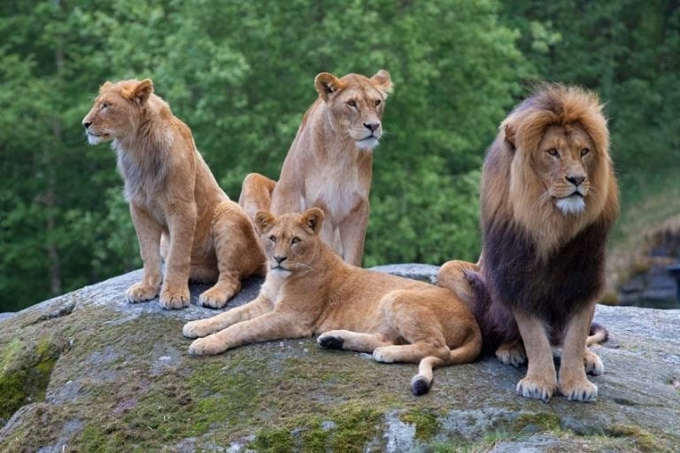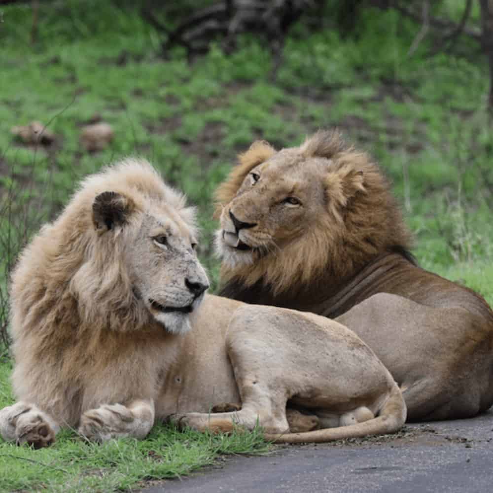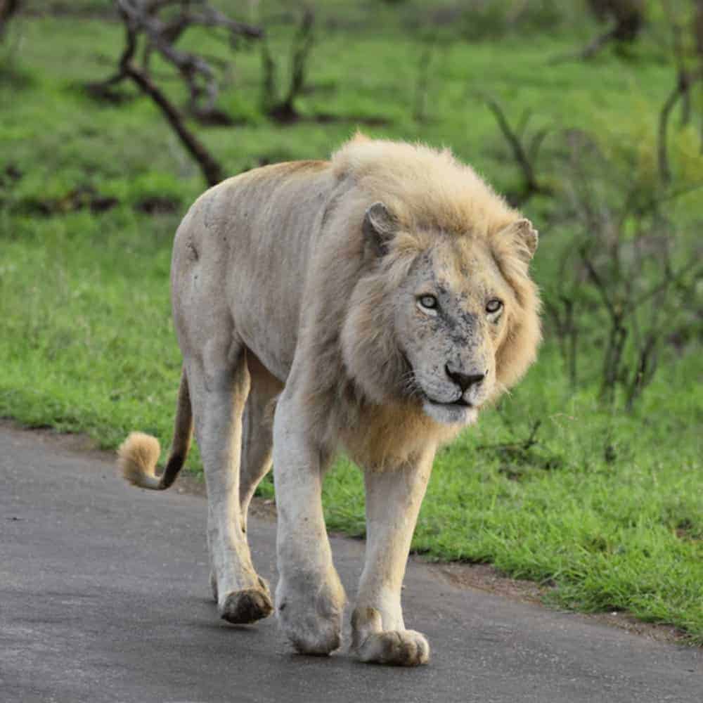In a vibrant wildlife sanctuary, Casper, the white lion, stands out with his regal presence, especially admired by his sub-adult daughters. His distinctive white mane and gentle nature enchant everyone who meets him.